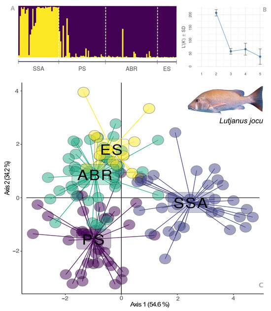 The results of the FST fixation and the D Jost indices confirmed the existence of genetic differentiation among the subpopulations of L. jocu across the sampled locations. Significant FST and D values were observed between SSA samples and other localities, and also between PS and ES, but differences between PS and ABR were detected only for D values (Table 3).