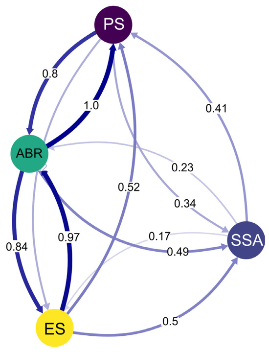 Data from the directional relative migration network between the sampled locations based on Nei’s GST. The arrows indicate the direction, and the thickness and colors of the lines represent the intensity of gene flow between the studied subpopulations. Legend: Salvador (SSA), Porto Seguro (PS), Abrolhos (ABR), and Espírito Santo (ES).