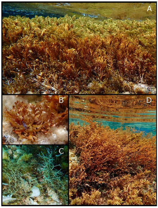 (A) Cystoseira compressa; (B) Cystoseira compressa f. rosetta; (C) Cystoseira pustulata; (D) Ericaria amentacea.
