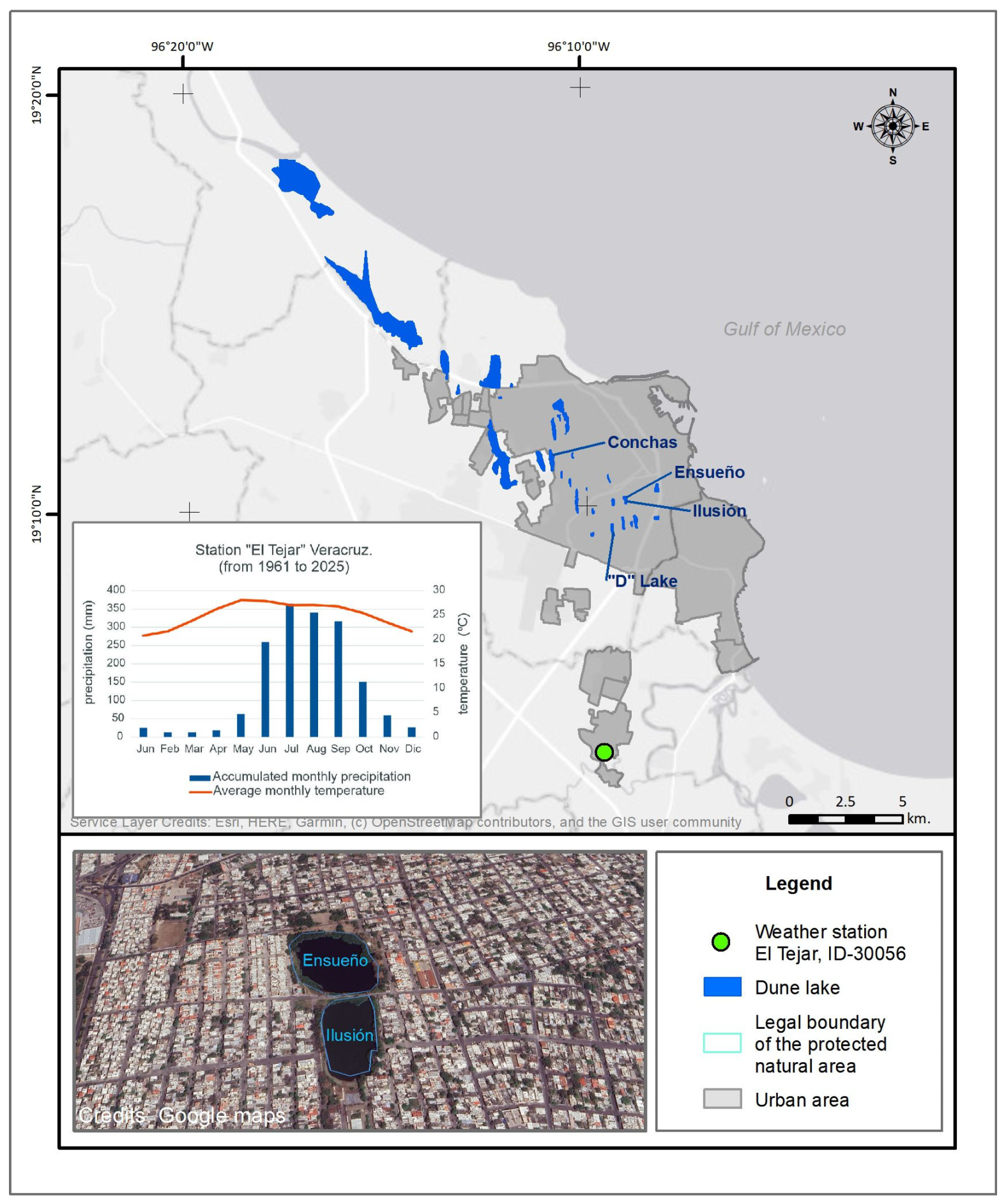 27]. They are a distinctive type of urban wetland in the coastal city of Veracruz. A set of 33 dune lakes has been designated as a protected area of 944 ha, officially named the Corredor Biológico Multifuncional Archipiélago de Lagunas Interdunarias de la Zona Conurbada de los Municipios de Veracruz y La Antigua [