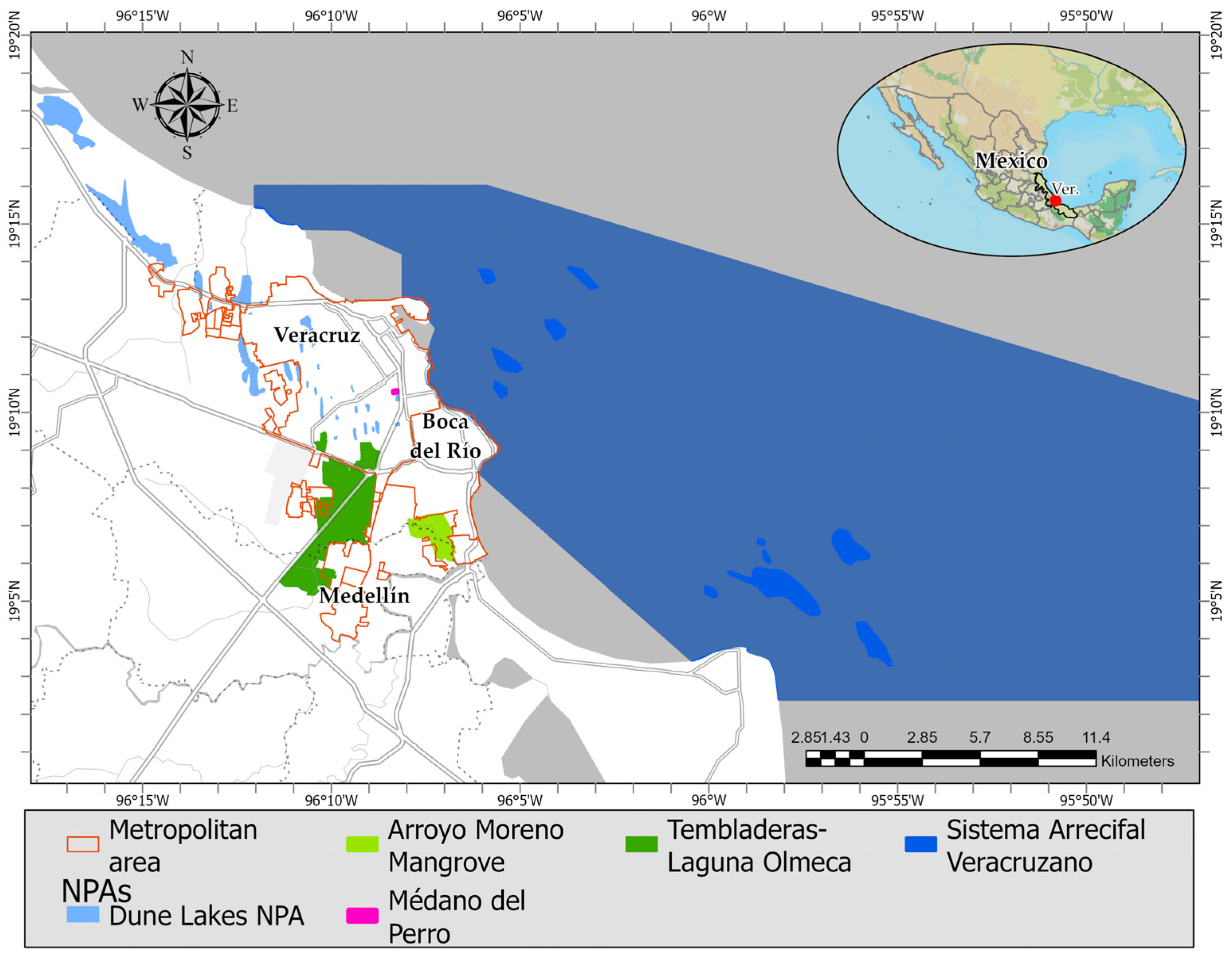 At the landscape scale, we focused on five Natural Protected Areas (NPAs) within the Veracruz–Boca del Río–Medellín metropolitan conurbation: Sistema Arrecifal Veracruzano, Médano del Perro, Arroyo Moreno (hereafter the Arroyo Moreno Mangrove), Tembladeras–Laguna Olmeca, and the Archipiélago de Lagunas Interdunarias (Dune Lakes NPA) (