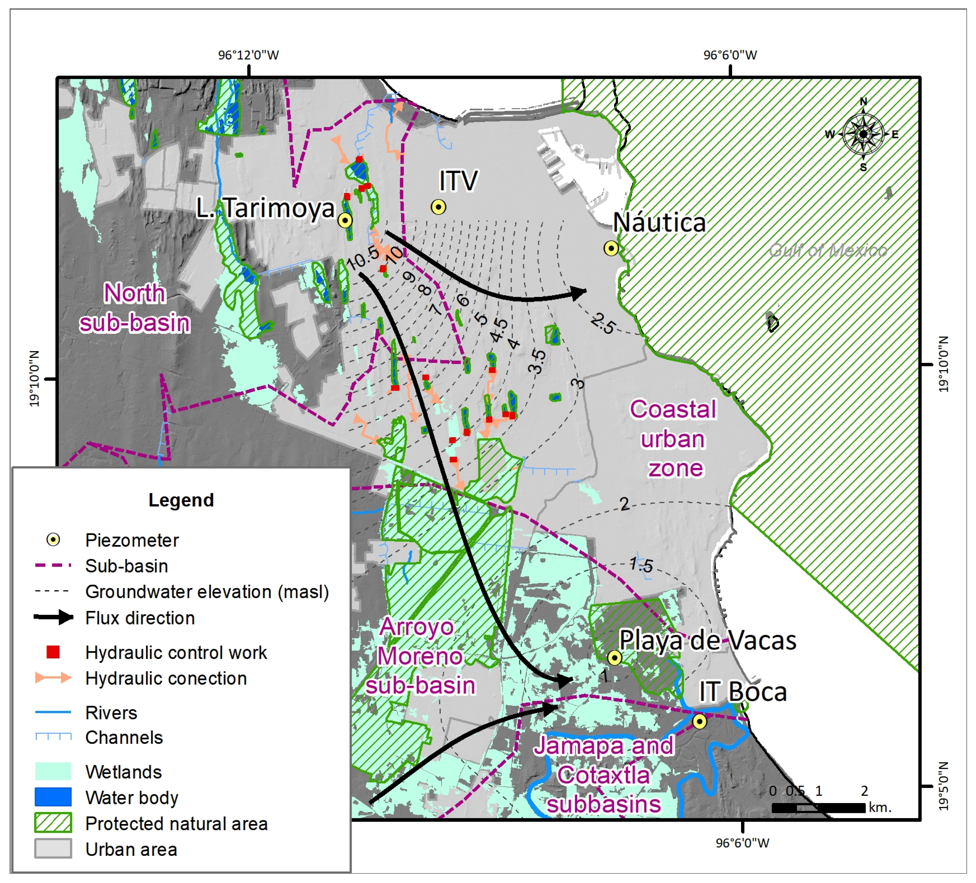 The Veracruz–Boca del Río–Medellín conurbation—combining a port city, an industrial center, and a tourism hub—has expanded over dunes and wetlands. The importance of wetlands within Veracruz city and nearby areas is recognized in multiple conservation strategies. Four protected natural areas are present in the region: the Arroyo Moreno mangroves (287 ha), the Tembladeras–Laguna Olmeca freshwater marshes (1069 ha), the dune lakes within Veracruz city (944 ha), and the nearby reef system (65,516 ha). This study analyzes wetlands from both landscape and local perspectives, using selected dune lakes within the urban area as case examples.