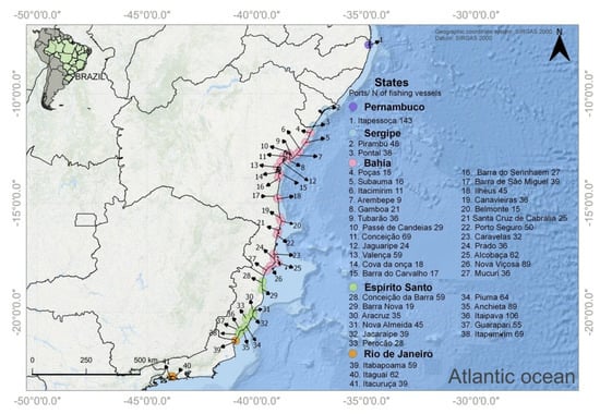 The Brazilian coast, especially the eastern part, is among the most fishery productive areas in the South Atlantic Ocean. Further, the extended continental shelf comprises the largest and most biodiverse coral reef complex in the South Atlantic [,,]. Data were collected between 2018 and 2022 in the coastal regions of Brazil (7° 45′ S, 34° 50′ W and 22° 56′ S, 43° 47′ W), which are traditional harbors for artisanal and commercial fishing fleets that catch different pelagic and demersal marine fishes and many crustacean species. A total of 41 ports were investigated (Figure 1) and grouped into the following three types: (a) ports where the vessels are mostly docked near the shoreline; (b) ports where vessels are anchored along estuarine channels and embayments away from the ground walkway, and (c) ports where there is a combination of (a) and (b).