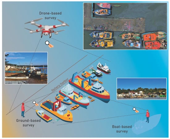 In this study, the performance of drone surveys compared to traditional surveys (i.e., land-harbor and onboard views) was evaluated to assess the cost-effectiveness of drones for the collection of fishing fleet data. The primary aim of this study was to compare survey methods (land-based observers, boat-based observers, and drone collected images) to count commercial and artisanal fishing vessels and categorize their gear in a variety of ports. We hypothesized that in-field quantification and the identification of fishing vessels and aspects of the fishing operation (i.e., number and types of fishery gear on the deck) would be improved using drone surveys. Finally, the potential of the drone approach for future inspection and the monitoring of fishing fleets, and management improvement, was revealed.