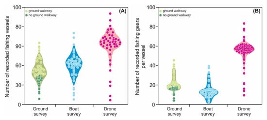 Number of fishing vessels (A) and onboard fishing gears (B) from the ground (shades in green), boat (light blue tones), and drone surveys (pink tones) at the study ports. The larger widening of the shading area in violin plots indicates greater probability of occurrence of the observed pattern.