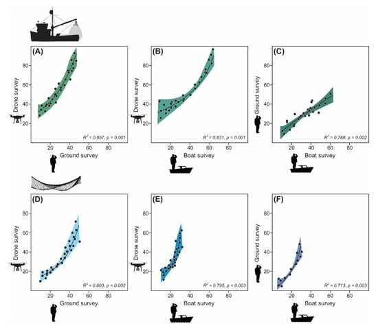 Estimation of the relationship (coefficient of determination (R2)) between fishing vessel counts (A–C) and onboard fishing gear (D–F) counts using drone-, ground-, and boat-based survey data. The silhouettes above the panels represent vessel and gears counts, respectively.