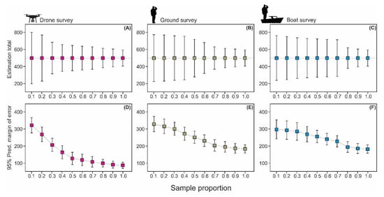 The confidence bounds around the predicted estimates of vessel counts considerably narrowed from 0.3 sampled proportion for the drone-based survey, indicating consistency and stability in the estimates obtained (Figure 6A). For the ground- and boat-based survey protocols, the predicted estimates of the sampled proportion was 0.6 and 0.8, respectively (Figure 6A,B). The level of uncertainty around the estimates associated with performance vessel counts (predicted margin of error) varied among the surveys; there was higher precision for estimates obtained from drone-based surveys (Figure 6D) in comparison with ground- and boat-based survey protocols, respectively (Figure 6E,F). The RSE (±standard deviation) obtained using the survey protocols for sampling proportions from 0.3 was below the 20% threshold for the drone-based survey, whereas those for the ground- and boat-based surveys were below 35% and 40%, respectively (Table 1). The relationship between the sampled proportion and RSE shows an exponential decay at the sampling proportion, with an improved level of precision for the drone-based survey (Figure 6D). The coverage rates for the survey protocols were within the acceptable range, regardless of the sampling proportion. However, the drone-based survey achieved over 90% coverage across the various sampling proportions (Table 1). At the 0.3 sampling proportion, the drone-based survey achieved almost full coverage. Further, the differences in coverage performance were more apparent when the drone-based survey was compared with the human-based surveys (Table 1).