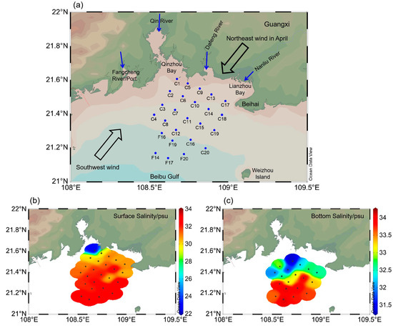 (a) Seawater sampling sites in the offshore area of Beihai, Guangxi, China. Black arrows indicate seasonal monsoon patterns, i.e., northeast winds in winter and southeast winds in summer. In April, the study region was dominated by northeast winds. Blue arrows represent river discharges into the northern Beibu Gulf, including the Fangcheng River, Qin River, and Nanliu River. (b,c) show the distributions of salinity measured on-site in the surface and bottom waters, respectively.