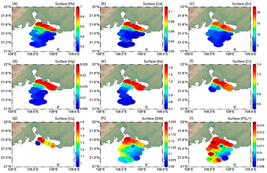 Distribution of heavy metals in surface seawater, including (a) Pb, (b) Cd, (c) Zn, (d) Hg, (e) As, (f) Cr, (g) Cu, (h) DIN, and (i) PO43−. Heavy metals exhibit a clear decreasing trend from the northeast toward the southwest.