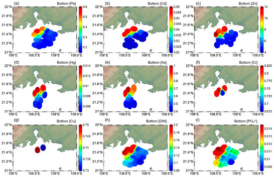 Distribution of heavy metals, including (a) Pb, (b) Cd, (c) Zn, (d) Hg, (e) As, (f) Cr, (g) Cu, and DIN (h), and PO43− (i) in bottom seawater. Heavy metals exhibit a clear decreasing trend from the northwest toward the southeast, consistent with the trends of DIN and PO43−.