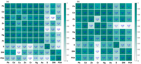 The correlation analysis of heavy metals and salinity (S), DIN, PO43− in the surface (a) and bottom (b) seawater offshore Beihai in the Beibu Gulf. Asterisks in the figure denote statistical significance: * for p < 0.05, and *** for p < 0.001.