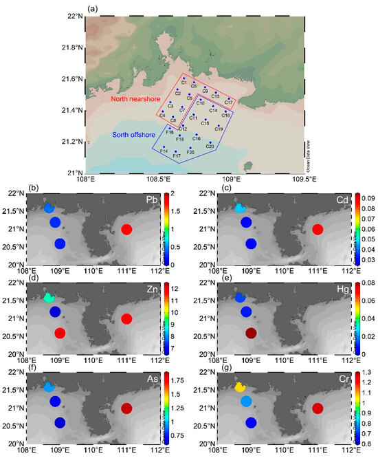 With rapid economic and social development, large quantities of anthropogenic sources of heavy metals have been discharged into coastal environments [1,2,3,4,5,6,7]. Heavy metals are a group of elements naturally found in the Earth’s crust and are widely used in industrial, domestic, and agricultural activities. Due to the significant increase in these activities, the production and use of heavy metals have also increased [8,9,10,11,12]. Therefore, heavy metals such as mercury (Hg), arsenic (As), cadmium (Cd), lead (Pb), zinc (Zn), and copper (Cu) are often analyzed to assess pollution levels in global coastal areas [11,13,14,15,16,17,18,19,20,21,22,23,24]. Once released into seawater, they can be transported by ocean currents, resulting in the wide spread of heavy metals in the marine environment [25,26,27,28,29].