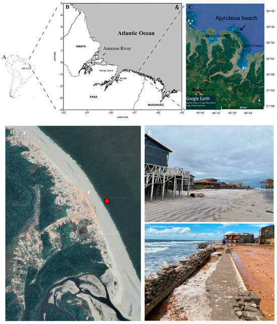 Study area focusing on (A) South America, (B) the Brazilian Amazon coastline, (C) the Bragantinian Peninsula, including the Caeté and Taperaçu estuaries as well as Bragança city, (D) Ajuruteua Beach, (E) unregulated development within the intertidal zone of Ajuruteua Beach, and (F) erosion in the waterfront area of Ajuruteua Beach. The red circle in Figure 1D marks the location of the oceanographic station.