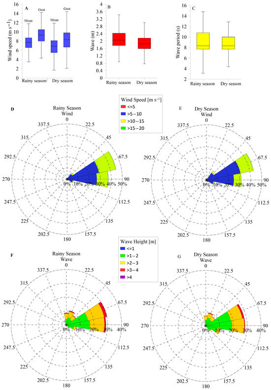 Box plot of wind speed (A) and wave height (B) in rainy and dry seasons and seasonal wind and wave directions (θ °N), as well as a histogram (%) (C) of the wind speed classes (rainy (D) and dry (E) seasons) and wave height (rainy (F) and dry (G) seasons) from the NOAA (station 41041) for the period of 2006–2018.
