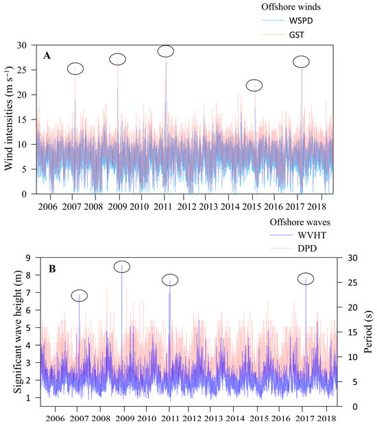 Offshore (A) wind (intensity in m s−1) and (B) wave (height (m) and period (s)) conditions between 2006 and 2018. The circles mark the maximum values in the dataset.