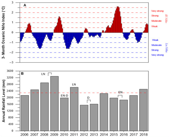 (A) Three-month Oceanic Niño Index and (B) annual rainfall levels from 2006 to 2018, emphasizing key climate events (LN = La Niña; EN = El Niño; D = drought), alongside the historical average (red line). Data sources: the NOAA for (A) and the INMET for (B).
