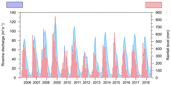 Monthly variation in river discharge (m3 s−1) and rainfall (mm) from 2006 to 2018. (Source: river discharge obtained from ANA and rainfall levels obtained from INMET).