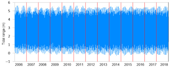 The tidal elevation in the study area is predominantly influenced by macrotides, with spring tides varying between 5.0 and 5.5 m, while neap tides range from 3.5 to 4.5 m. Notably, Figure 6, derived from CHN data, excludes the impacts of climate oscillations.