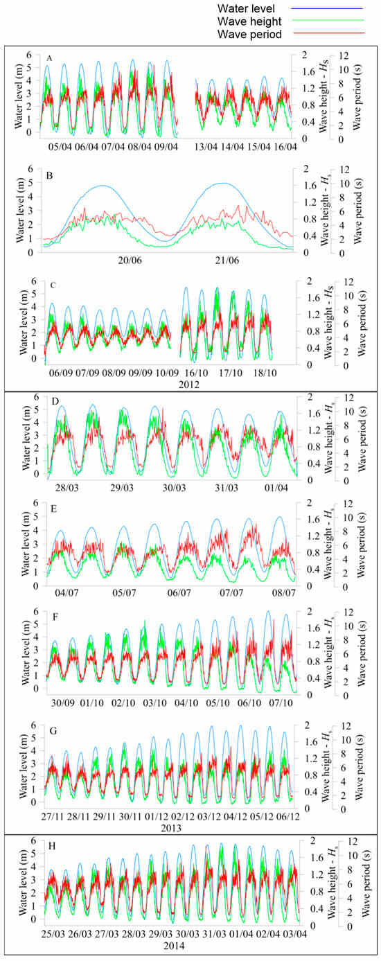 Representation of water level (blue line), significant wave heights (Hs, green line), and wave periods (T, red line) observed during various months in 2012 (A–C), 2013 (D–G) and 2014 (H) at Ajuruteua Beach.