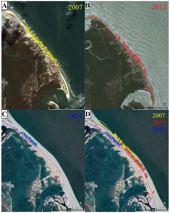 Google Earth satellite image showing the coastline (lines) and house locations (pins) in three years—(A) 2007 (yellow), (B) 2013 (red), and (C) 2021 (blue)—highlighting the effects of coastal erosion in the study area. Image (D) illustrates how the coastline changed over the three-year period.