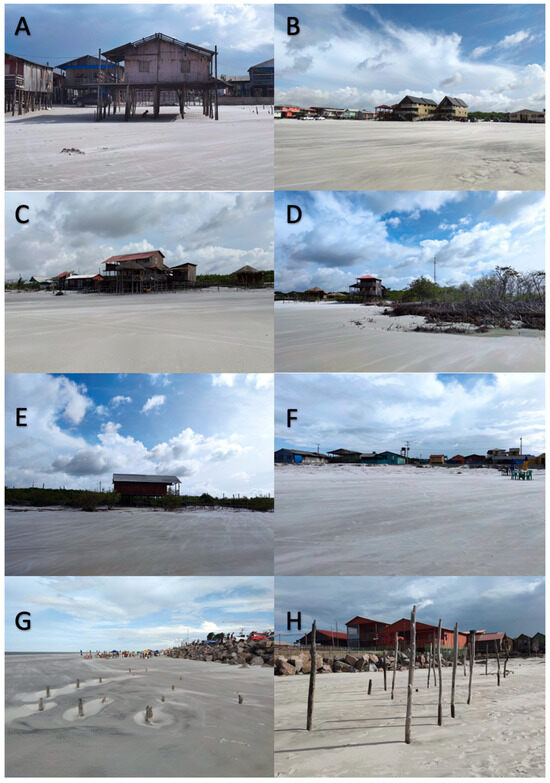 Photographs documenting unregulated occupation in the intertidal zone and frontal dunes in 2021 are presented in Figure 9. These images show stilt houses located in the northwestern sector (Figure 9A–F) as well as destroyed structures—evidenced by the remaining stilt supports—located in the central portion of the beach (Figure 9G,H).