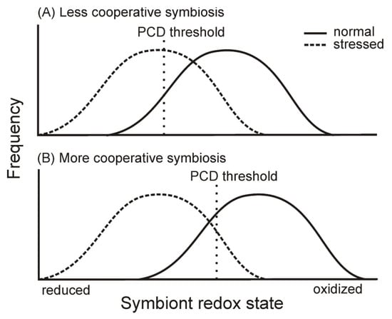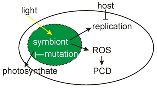 49]. In a cooperating symbiont, on the other hand, these ROS may trigger the export of end products before they reach levels that impact viability. An ROS signaling pathway that triggers cell death clearly constrains the variation at the lower level. On the other hand, a pathway that leads to photosynthate export does not do this.