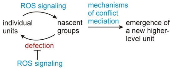 16]. With the conflicts inherent in forming a symbiosis thus diminished, cooperation is favored. ROS signaling early in an evolutionary transition thus can lead to sharing and sharing can lead to groups. In this sense, this hypothetical ROS signaling arbitrates conflict by creating the higher-level unit that can then function as a target of selection. These initial steps occur largely as a by-product of individual-level selection. As suggested by