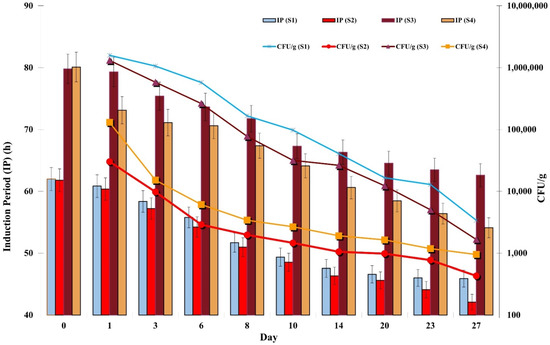 Induction periods (IP) and colony-forming units (CFUs) per g of lipid phase of tzatziki samples S1–S4 during 27 days of storage.