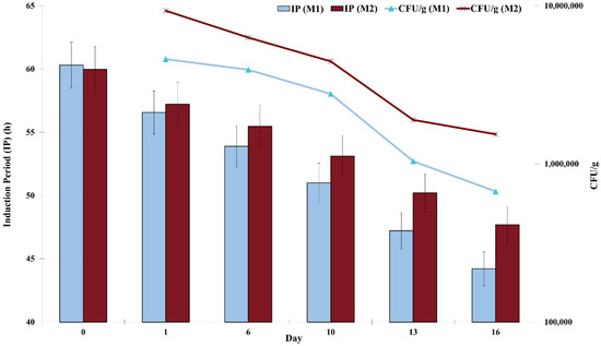 In the case that the microbial content of the salad is responsible for the oxidative stability of the product, it would be logical that the more microorganisms present in the sample, the higher the oxidative stability. Therefore, by suppressing the microbial flora of tzatziki, the oxidative stability would also decrease. To further examine this notion and the relation between microbial content and oxidative stability, two more tzatziki samples were prepared (M1 and M2), so as to determine the effect of garlic, cucumber, and preservatives on oxidative stability via microbial population. Moreover, this recipe better resembles the commercially available samples, and as such, a better overview of both homemade and commercially available samples is gained. Garlic is known to contain natural bioactive compounds (e.g., allicin) with antibacterial activity [23,24]. This is also the case with cucumber, which in addition can enzymatically form secondary bioactive compounds with various activities [1]. Moreover, sodium benzoate and potassium sorbate are well-known food additives, used to decrease the microbial population. Therefore, the addition of the above in sample M1 is expected to decrease the number of microorganisms compared to sample M2. The results for the two samples are given in Figure 2. The results validated our hypothesis that the addition of the antimicrobial ingredients would result in a faster reduction in the microbial population. Moreover, it can be seen that the resistance to oxidation of the lipid phase appeared to be significantly (p < 0.05) reduced after 16 days of storage for both samples. However, the oxidative stability of sample M2 declined to a lower extent compared to sample M1. Additionally, due to the nature of artificial preservatives used (sodium benzoate and potassium sorbate), it cannot be concluded that they act as pro-oxidants. Since the only difference between the two samples, apart from the existence or not of preservatives, garlic, and cucumber, was the microbial population, a correlation analysis was again carried out. The correlation coefficients were found to be 0.988 (significant for p < 0.01) and 0.984 (significant for p < 0.01) for samples M1 and M2, respectively. Again, the correlation was found to be high, strengthening out hypothesis that the oxidative stability of tzatziki is related to the microbial population, acting as a free radical and/or oxygen scavenger.