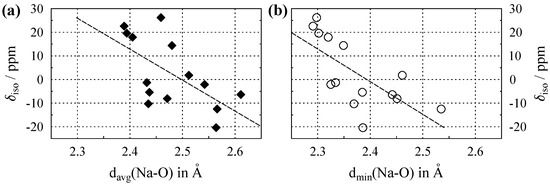 The isotropic chemical shifts () of Na in a number of inorganic compounds are tabulated in Table A1 in Appendix A, together with the parameters of their crystal structures: coordination numbers (), and both the average () and minimal sodium–oxygen () distance within the coordination sphere. Figure 2a shows the plot of versus , and Figure 2b the plot of versus . The data points in both plots display appreciable scatter, leading to Pearson correlation coefficients [23] that are comparatively low. By considering classes of sodium-containing compounds such as silicates, borates, carbonates, etc. in separate plots, these correlations can be substantially improved [14]. However, the purpose of the current work is to compare average to the shortest distance; therefore, members of various compound classes were included in our plots. It can be seen from the caption of Figure 2 that plotting the chemical shifts versus leads to a marginally better correlation coefficient. While this improvement might not be significant, the important advantage of using the minimal distance to oxygen is that, in contrast to the average distance , it is unequivocally defined in the crystal structure.