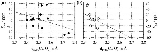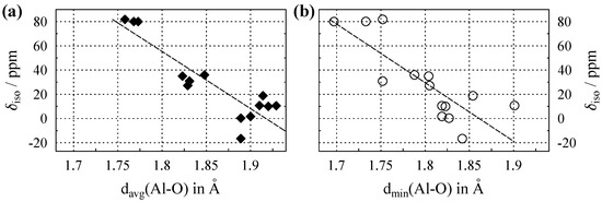 Obviously, it would be advantageous if one could obtain information about the distances of oxygen coordination via the parameter of the observed nuclide, which is comparatively easy to extract from NMR spectra. Such correlations have indeed been suggested for the oxygen coordination sphere of Na [13,14], Al [15], Ca [16], and Pb [17]. In these papers, it was assumed that the isotropic chemical shift of an observed nuclide X, which is surrounded only by oxygen, depends on the average X–O distance, , calculated over the oxygen atoms coordinating X. However, is distinctly dependent on the choice of this coordination sphere, and the coordination number () defined by it. The question of how to define a coordination sphere in a periodic structure is indeed complex and still a matter of debate among chemists and crystallographers [18]. Recently, it has been suggested to circumvent this problem by using the shortest X–O distance found in the structure, , instead of the average over the neighboring atoms. For Pb (with spin ) in oxygen surroundings, use of leads to improvements in the correlation [19].