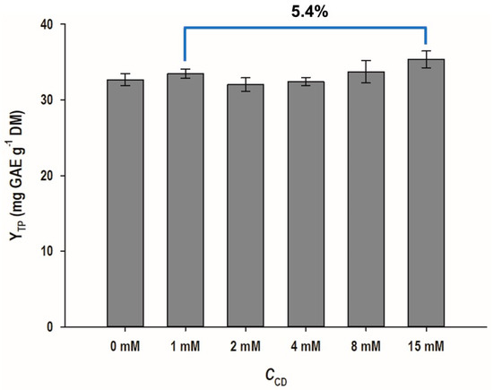 Prior to setting up the experimental design, an issue of high significance was the range of CCD that should be tested. Thus, a single-factor experiment was judged necessary in the light of previous recent investigations, which indicated that CCD increases beyond a certain limit did not provide significantly higher total polyphenol yield (YTP) [19,23]. Figure 1 depicts the results of the testing of the effect of CCD on YTP, and it can be seen that for extractions with CCD higher than 1 mM, the increase in YTP was either lower or statistically non-significant (p < 0.05). This was emphasized by the finding that a solution with CCD of 15 mM afforded a YTP higher by only 5.4% compared to that with CCD of 1 mM. On this ground, it was evidenced that a range of CCD from 0 to 2 mM would actually reveal a significant effect on YTP. Furthermore, considering recent kinetic studies, which showed that extraction time longer than 180 min did not afford significant changes in YTP, irrespective of the extraction temperature [17,24], this resident period was adopted for all subsequent experiments.