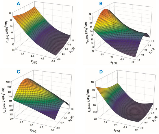 The assessment of model fitting and the suitability of the response surface was based on the analysis of variance (ANOVA) and lack-of-fit test (Figures S1–S4, supplementary file), taking into consideration the closeness of the predicted and measured response values (Table 2). The relevant statistical processing revealed the significance of the coefficients obtained for each model according to the second-degree polynomial equations (Figure S1, inset table “Parameter estimates”). These equations, composed only of the significant terms, are presented in Table 3. The R2 determined in each case gave an indication of the total variability around the mean, explained by the model. It can be seen that all R2 determined were higher than or equal to 0.97, and it could be supported that the models displayed a good fit to the sample data. The p value for lack-of-fit (confidence interval of 95%) was also significant for all responses considered, indicating that the fitted models may be very good predictors. For each response, the effect of the variables was depicted as 3-dimensional diagrams, and it can be distinguished that the response pattern for YTP and PR was very similar (Figure 2). This was also the case for YTFn and AAR. These trends might indicate that the conditions that favored obtaining extracts with increased total polyphenol concentration also displayed increased PR. A similar claim might hold true for YTFn and AAR.