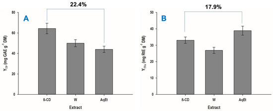 Considering that the level of CCD for optimization of all responses (YTP, YTFn, AAR, and PR) did not coincide, a peppermint extract was prepared using a β-CD solution with a concentration of 1.08 mM. This value represented an average of the optimum required to achieve maximum YTFn and AAR (Table 4), and it was regarded as a fair compromise to come up with an extract enriched in flavonoids with increased antiradical activity. This extract’s composition and antioxidant characteristics were then compared to those of extracts prepared with water and 60% aqueous ethanol. It can be viewed in Figure 3A that the extract produced with β-CD had 22 and 31% higher YTP compared to the aqueous and hydroethanolic extracts, respectively. On the other hand, the β-CD extract displayed 15% lower YTFn than the hydroethanolic extract but 18% higher than the aqueous extract (Figure 3B). Considering both YTP and YTFn, it could be argued that the β-CD-aided extraction of polyphenols from peppermint may provide yields comparable to those obtained with a green organic solvent (aqueous ethanol) and even more enhanced than those produced with aqueous extraction.