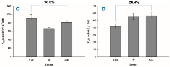 Comparison of the effectiveness of the β-CD-aided extraction with 60% aqueous ethanol (AqEt) and water with regard to total polyphenol yield (A), total flavonoid yield (B), antiradical activity (C) and ferric-reducing power (D). For the β-CD-aided extraction, a β-CD concentration of 1.08 mM was used at 80 °C for 180 min.