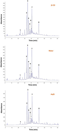 Chromatograms of M. piperita extracts were recorded at 320 nm. AqEt extract corresponds to 60% aqueous ethanol. For the β-CD-aided extraction, a β-CD concentration of 1.08 mM was used at 80 °C for 180 min. Peak assignment: 1, caffeic acid; 2, eriocitrin; 3, luteolin 7-O-rutinoside; 4, luteolin 7-O-glucuronide; 5, narirutin; 6, hesperidin; 7, rosmarinic acid; 8, luteolin derivative.