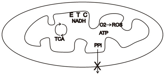 Simplified schemata of a protomitochondrion in metabolic state 4 [21]. The protomitochondrion exhibits a loss-of-function mutation and cannot export pyrophosphate (PPi). Under favorable conditions, the protomitochondria continues to oxidize substrate in the Krebs or TCA cycle until all of the ADP is converted to ATP. The electron transport chain (ETC) continues to oxidize NADH until the proton gradient is maximal and the electron carriers of are highly reduced. High levels of reactive oxygen species (ROS) result. In this way, hoarding the products of chemiosmosis may be detrimental to a protomitochondrion, while sharing with a proto-host (Figure 1) may be beneficial.