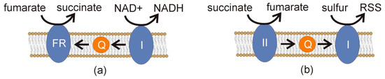 Simplified schemata of a scenario for RSS formation under anaerobic conditions. (a) As part of the reductive branch of malate dismutation [16], NADH is oxidized to NAD+ by complex I (I) of the electron transport chain (Figure 3). Electrons are carried by rhodoquinone (Q) to fumarate reductase (FR), reducing fumarate to succinate. (b) If succinate accumulates, it can inhibit the process in (a) and donate electrons to complex II (II) of the electron transport chain, resulting in reverse electron transport in which ubiquinone (Q) carries electrons to complex I (I), and these electrons are ultimately scavenged by sulfur to form RSS. Paralleling Figure 2, such RSS formation would select for exporting succinate and related products to avoid this sort of end-product inhibition.