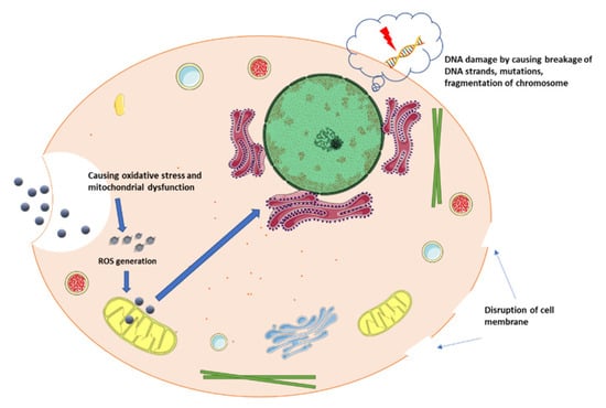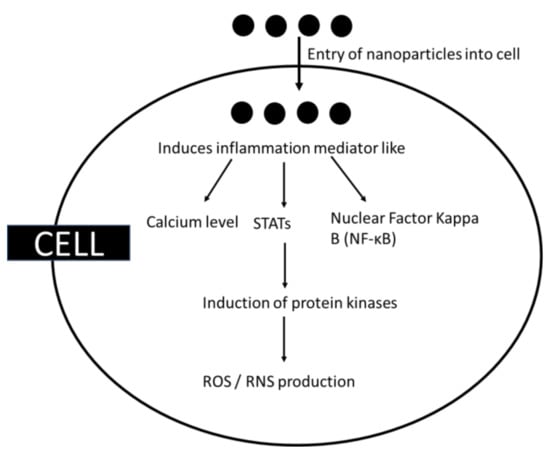 Metal nanoparticles can drive redox processes, resulting in the continuous endogenous generation of ROS in a positive feedback loop, causing major genotoxicity. The chronic oxidative stress that occurs following exposure to metal NPs is mediated by the upregulation of inflammatory mediators such as nuclear factor kappa B (NF-κB), signal transducer and activator of transcription (STATs), mitochondrial dysfunction, and higher intracellular calcium levels [63] (Figure 3). They can either directly or indirectly activate the mitogen-activated protein kinase pathways leading to the production of reactive free radicals [64,65]. As mentioned earlier, the physiochemical properties of metal NPs such as size, configuration, composition, shape, surface area, functionalization, charge, magnetic property, etc., have a direct/indirect and significant impact on the induction of oxidative stress [66] and lead to genotoxicity or cellular toxicity. NPs are directly responsible for causing ROS to form when they are in the acidic environment of lysosomes. NPs have been proven to cause damage to the DNA strands and change gene expression [64,65]. It was reported that ROS generation caused by hydrophilic NPs such as titanium oxide can lead to cancerous growth. In one study, titanium NPs was found to cause benign mouse fibrosarcoma that later became malignant [65].