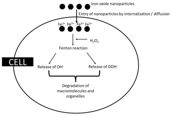 Through the Fenton reaction, iron nanoparticles produce redox-active iron and hydroxyl ions in the presence of hydrogen peroxide (refer to Equation (1)) [67,68], leading to the release of hydroxyl radicals. A particular illustration of the Fenton reaction is the Haber–Weiss reaction. In order to create a reactive species that can oxidise a wide range of organic substrates, hydrogen peroxide and ferrous salts must react. If Fe2+ can be produced from Fe3+ again, iron may have catalytic properties [69]. Superoxide radicals also liberate Fe2+ from ferritin, an intracellular iron-storage protein, or other proteins with [4Fe-4S]2+ clusters that favour the Fenton reaction. Furthermore, NADH triggers the Fenton reaction by reloading Fe2+ from Fe3+ [67].