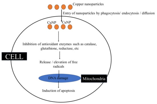 Copper nanoparticles (CuNP) are widely used as they possess various bioactivity, including antimicrobial activity [80]. They do induce ROS generation where the biological responses are dependent on the amount of ROS released, the type of cellular pathways, etc. Copper nanoparticles act as pro-oxidants, meaning that they induce ROS production or inhibit antioxidants, thereby increasing oxidative stress [81]. The intake of CuNP by immune cells is through phagocytosis, endocytosis, passive diffusion, etc. Passive uptake does take place by direct interaction by modulating the NLRP3 inflammasome. Copper nanoparticles interact with cell surface receptors and activate intracellular pathways including the MAPK pathway, TLR4 pathway, and lectin pathway for the entry and induction of inflammation [81,82]. Fahmy et al. [83] recorded the inhibitory action of copper nanoparticles against cellular antioxidant enzymes such as catalase and glutathione reductase and increase the glutathione peroxidase activity. This suggests that copper nanoparticles are not only able to generate reactive oxygen species, but also inhibit the antioxidant defences of cells (Figure 5). Fahmy et al. [83] also found that co-treating CuNP with antioxidant resveratrol increased the life of cells. The cytotoxicity of Cu2+ was found to be caused by DNA damage and apoptosis-mediated cell death [83,84]. Similarly, a study by Zhou et al. [85] observed that, on exposure to copper nanoparticles, there was a higher apoptotic rate. It was also recorded that copper nanoparticles administered by intranasal instillation are tend to accumulate in the liver by entering into the mucosa, encountering severe damage. This results in the release of ROS from liver cells, triggering an oxidative stress response that leads to ER stress and cell apoptosis [86]. There was an increased ROS production leading to genotoxicity and cancer formation in CuNPs treated with Mytilus galloprovincialis [87].