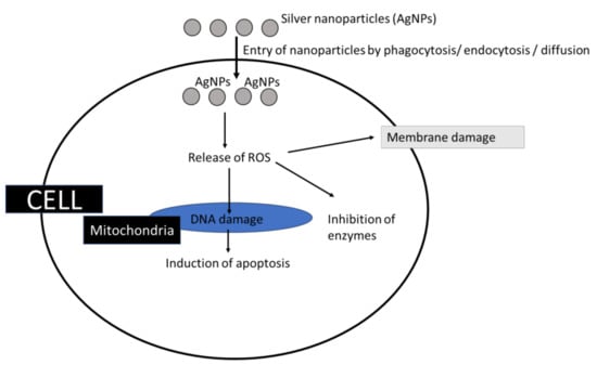 These characteristics are attributed to their higher ability to induce ROS. In addition to interacting with the cell membrane, AgNPs internalize and enter the cell through diffusion or membrane damage [90]; mostly, Ag+ dissociates from the nanoparticle core and stimulates ROS production [86,91,92]. The ROS produced are cytotoxic (even the AgNPs are directly cytotoxic) and the genotoxic effects mostly lead to apoptosis/membrane damage/enzyme inhibition etc. (Figure 6). When the silver nanoparticles react with membrane proteins containing sulfur, enzymes and proteins bound to the membrane become inactive. By attacking the membrane, silver nanoparticles can disrupt the respiratory chain and reduce energy production. They also attack unsaturated fatty acids on cell membranes and alter membrane fluidity, thereby impairing cell function by destroying membrane permeability and integrity [93,94]. It is reported that silver nanoparticles could cause apoptosis by the activation of caspase in-vivo [95].