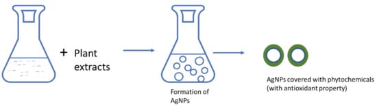 In an earlier section, the oxidant properties of silver nanoparticles that can inhibit cell growth by interfering with membrane proteins or signaling pathways were discussed. Furthermore, the ability of silver nanoparticles to interact with sulfur groups of proteins, especially on antioxidant enzymes, and interfere in antioxidant activity, was considered. A huge number of articles on the antioxidant activity of silver nanoparticles have been published in recent years [109]. Using nanoparticles as radical scavengers, for their redox potential, or as carriers for antioxidant compounds are developing fields of research in the science of oxidative stress [94]. The antioxidant properties of AgNPs might be depended on methods of preparation (Figure 6), but in most cases AgNPs are prepared using plant extracts [110,111]. These phytochemicals do help inform us on nanoforms and the antioxidant activity of AgNPs. Ansar et al. [112] synthesized Ag NPs from Brassica oleracea leaves with a good scavenging percent ranging from 60 to 80%. The abundance of surface-generated flavonoids and phenolics as capping agents could be the reason for antioxidant activity of these nanoparticles [110]. AgNPs mediated by aerial parts of Lavandula stoechas was reported to scavenge DPPH radicals of 75% at 25 mg/mL through their phytochemical constituents’ such as phenols, terpenoids and flavonoids [111].