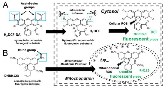 - Keller, A.; Mohamed, A.; Dröse, S.; Brandt, U.; Fleming, I.; Brandes, R.P. Analysis of Dichlorodihydrofluorescein and Dihydrocalcein as Probes for the Detection of Intracellular Reactive Oxygen Species. Free Radic. Res. 2004, 38, 1257–1267. [Google Scholar] [CrossRef]