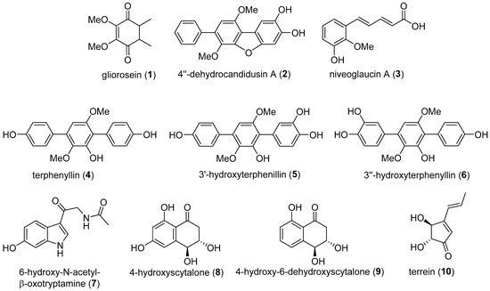 Our investigation from last year of marine fungal metabolites with various biological activity resulted in discovery of a number of polyketides and alkaloids with cytoprotective properties (Figure 1). Polyketide gliorosein (1) protected the cardiomyocytes H9c2 from rotenone and cobalt (II) chloride induced damage [19]. p-Terphenyl polyketides terphenyllin (4), 3″-hydroxyterphenyllin (5), and 3′-hydroxyterphenyllin (6) significantly increased the viability of paraquat- and rotenone-treated Neuro-2a cells [20]. Another polyketide niveoglaucin A (3) increased the viability of 6-hydroxydopamine-treated Neuro-2a cells [21]. 4-Hydroxyscytalone (8) and 4-hydroxy-6-dehydroxyscytalone (9) have shown significant increasing of paraquat- and rotenone-treated Neuro-2a cell viability [22]. Finally, a new melatonin analogue 6-hydroxy-N-acetyl-β-oxotryptamine (7) and other p-terphenyl polyketide 4″-dehydroxycandidusin A (2) demonstrated neuroprotective effects [23]. In all experiments, the cytoprotective influence of the compounds was accompanied with the decrease in ROS level mediated by neurotoxins in treated cells that indicates their likely effect on the intracellular antioxidant system.