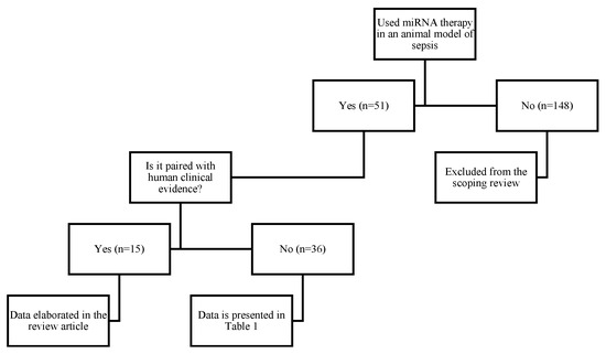 The information source and search strategy was limited to PubMed, which was searched until 15 October 2023, using the keywords (microRNA) AND (sepsis) AND (animal model). We specifically excluded papers that did not focus on microRNAs as the targets of therapy, that did not include animal models, that did not show organ failure-specific assessments, and that focused on microRNAs as biomarkers. The PRISMA-ScR guideline was used in this study.