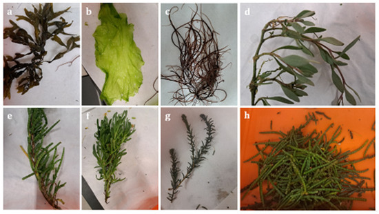 Seaweed species: (a) Fucus spiralis, (b) Ulva rigida and (c) Gracilaria gracilis; halophyte plants: (d) Halimione portulacoides, (e) Sarcocornia perennis, (f) Inula crithmoides, (g) Sueda vera and (h) Salicornia ramosissima.