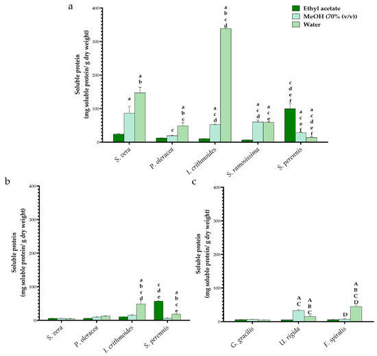 Soluble protein determined in leaves (a) and in stems of HAs (b) and in seaweed (c). For HAs, statistical differences compared with a—ethyl acetate extraction and b—methanol extraction between the same species (c—S. vera, d—P. oleracea, e—I. crithmoides and f—S. ramosissima) mean significant differences between the same extraction solvent. For seaweed, statistical differences were compared with A—ethyl acetate extraction and B—methanol extraction in the same species (C—G. gracilis and D—U. rigida) between the same extraction solvent.