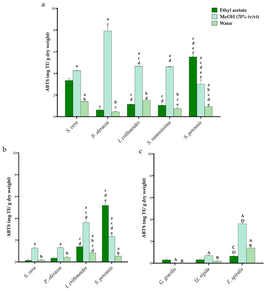 ABTS radical determined in leaves (a) and in stems of HAs (b) and in seaweed (c). For HAs, statistical differences compared with a—ethyl acetate extraction and b—methanol extraction between the same species (c—S. vera, d—H. portulacoides, e—I. crithmoides and f—S. ramosissima) mean significant differences between the same extraction solvent. For seaweed, statistical differences were compared with A—ethyl acetate extraction and B—methanol extraction in the same species (C—G. gracilis and D—U. rigida) between the same extraction solvent.