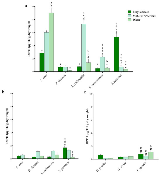 DPPH determined in leaves (a) and in stems of HAs (b) and in seaweed (c). For HAs, statistical differences were compared with a—ethyl acetate extraction and b—methanol extraction between the same HAs (c—S. vera, d—H. portulacoides, e—I. crithmoides and f—S. ramosissima) between the same extraction solvent. For seaweed, statistical differences were compared with (C—G. gracilis and D—U. rigida) between the same extraction solvent.